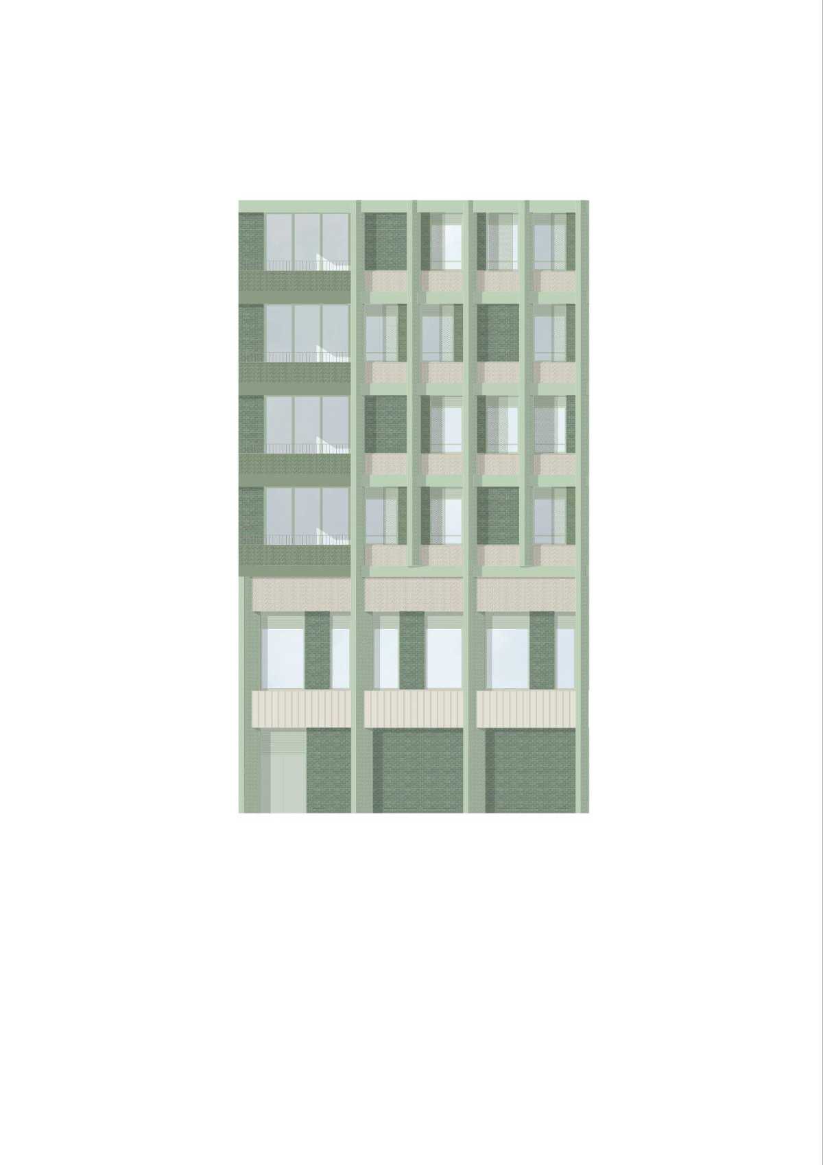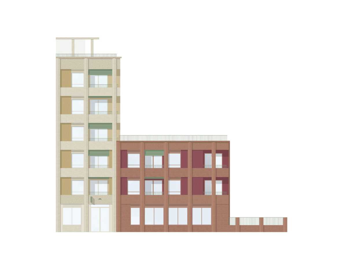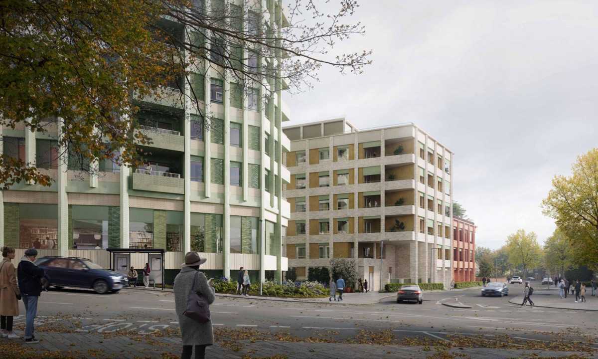 R1, the taller building facing the High Street, provides slender dual-aspect apartments with inset balconies and generous views, its faceted façade addressing both townscape and microclimate considerations. R2 offers specialist housing for older residents, designed around health, accessibility, and wellbeing, and reintegrates with the scale and character of nearby Edwardian terraces. C1 provides flexible workspace, responding sensitively to the Grade II-listed Former St Mark’s School through a restrained brick expression that balances heritage with new use.