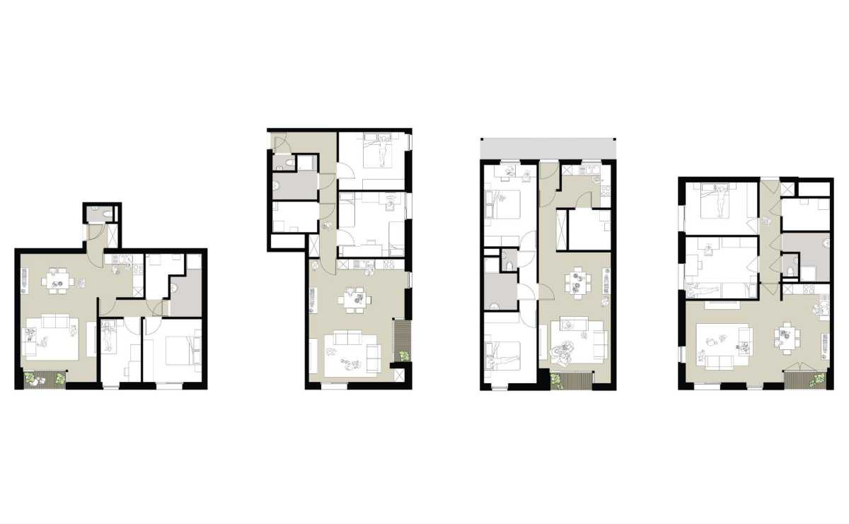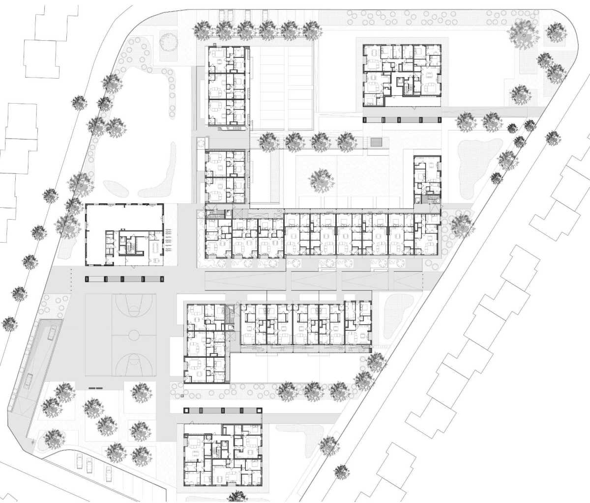 The project was therefore reorganised in phases in order to introduce a new, inclusive civic space, communal gardens and a pedestrian street through the centre animated by regular front doors. Private balconies for each unit and external common circulation spaces give residents views over-looking gardens and these active, shared spaces. The courtyards, gardens and stepped entrance spaces define a clear set of thresholds between public and private. A vital new community centre - for residents and visitors - is positioned in the heart of the plan.